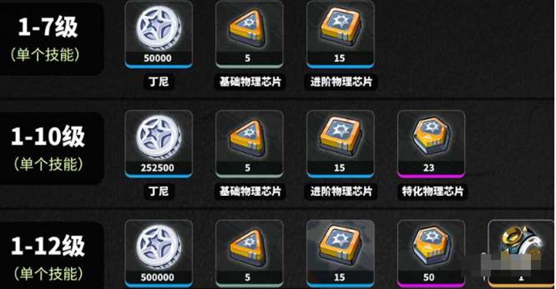 技能等级提升:1-7级:丁尼×50,000基础物理芯片×5进阶物理芯片×15