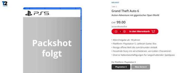 近日,关于《GTA 6》的发售信息引发了广泛关注。据外媒报道,瑞士知名购物网站Brack.ch上出现了《GTA 6》的预购页面,显示PS5和Xbox Series X|S版本的售价为99瑞士法郎,约合人民币814元。