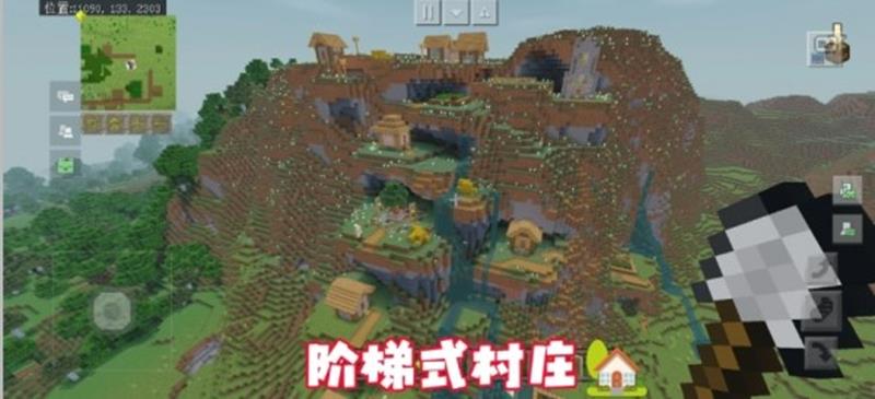 阶梯式村庄坐标:/tp:11090 133 2303,进入游戏后选择创造模式,不然传过去会把自己摔坏了。