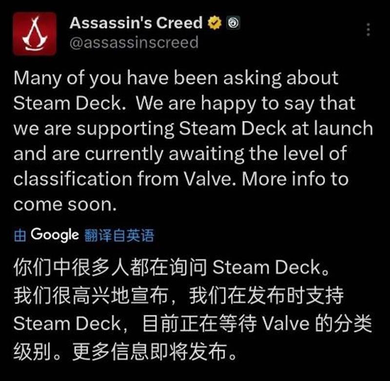 此前育碧曾表示,《刺客信条:影》暂未适配SteamDeck。但今日凌晨,育碧的最新公告确认,本作将在首发时支持SteamDeck,目前正在等V社的适配性分类。