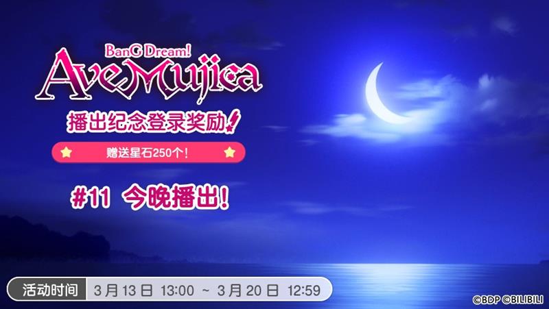此外,为庆祝《BanG Dream! Ave Mujica/颂乐人偶》动画的播出,游戏内还同步开展了登录奖励活动。自2025年1月9日起,每周随着动画的播出,玩家登录游戏即可领取「星石×250」的奖励。