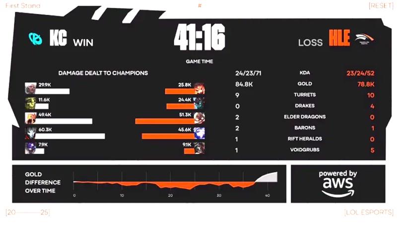 19分钟HLE在小龙团战中完美拉扯,击杀KC多人并收下小龙。22分钟HLE利用人数优势击杀多人并收下厄塔汗,奠定巨大优势。27分钟HLE越高地击杀KC众人,经济领先达到1万。最终在30分15秒,HLE团灭KC,以2比1的总比分击败KC,以不败战绩晋级淘汰赛。