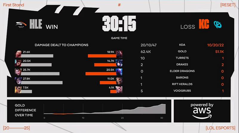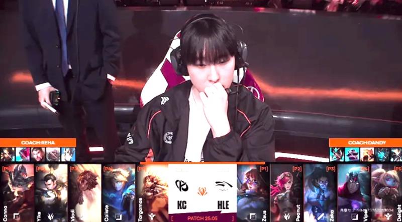 首局比赛,KC选择兰博、赵信、岩雀、伊泽瑞尔和蕾欧娜的阵容,HLE则以阿萝拉、蔚、塞拉斯、韦鲁斯和波比应对。比赛仅4分钟,HLE的Zeka塞拉斯便通过精准操作完成单杀,为队伍赢得先机。15分钟时,KC下路集结四人击杀HLE上辅,但HLE并未慌乱,27分钟在野区打出1换3,29分钟Zeka塞拉斯偷取岩雀大招搅乱KC后排,助力HLE团战取胜。最终在35分24秒,HLE凭借强大输出一波结束比赛,拿下首局。