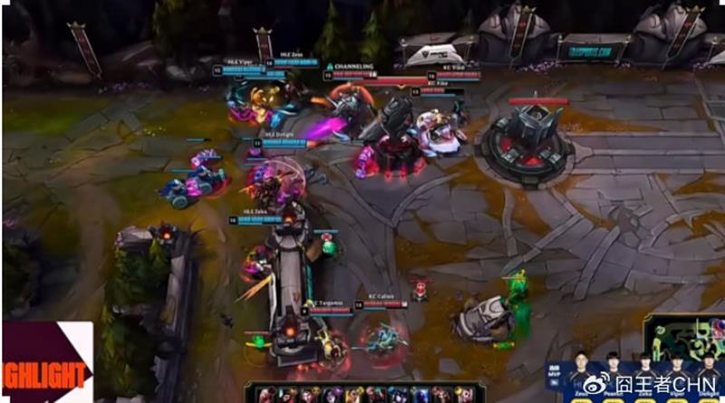关键的第三局比赛,HLE蓝色方禁用婕拉、维克托等英雄,选用吸血鬼、猴子、杰斯、卡莎和芮尔;KC红色方禁用豹女、永恩等英雄,选用赛恩、猪妹、瑞兹、德莱文和洛。比赛2分钟,Yike猪妹灵性绕后配合队友击杀杰斯拿下一血。