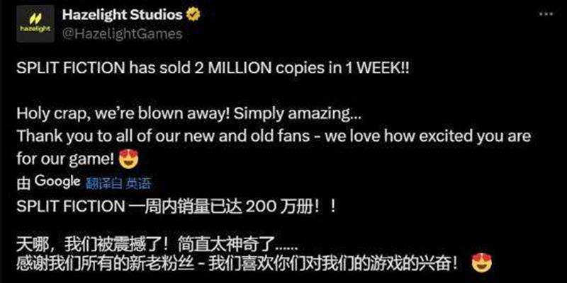 而就在昨晚(3月13日)23点,开发商Hazelight Studios在推特发文宣布,《双影奇境》发售仅一周时间,全球范围内总销量已突破200万份!