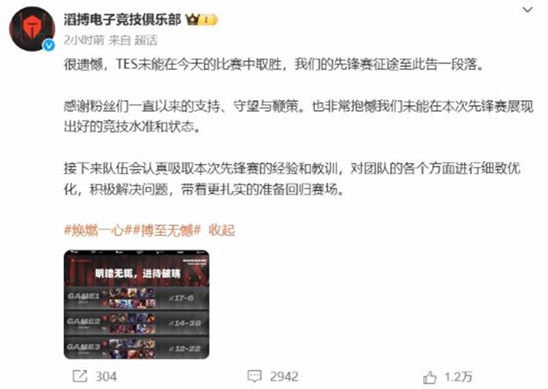 TES战队在赛后的官方声明中表示:“很遗憾,TES未能在今天的比赛中取胜,我们的先锋赛征途至此告一段落。感谢粉丝们一直以来的支持、守望与鞭策。也非常抱憾我们未能在本次先锋赛展现出好的竞技水准和状态。”