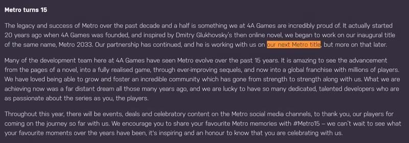 这一成就离不开4A Games团队的努力,他们见证了《地铁》系列的演变,并且一直与原著小说作者Dmitry Glukhovsky保持合作。如今,Dmitry Glukhovsky正在与4A Games团队合作开发下一款《地铁》作品。