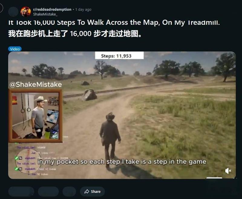 这位名为 ShakeMistake 的玩家,在《荒野大镖客 2》的 Reddit 社区分享了他这次独特的“步行”经历。他通过一款名为 StepL 的安卓智能手机应用程序,将手机的陀螺仪输入转化为游戏内的移动指令,从而实现了用跑步机控制亚瑟・摩根在游戏中的行走。