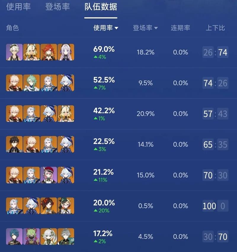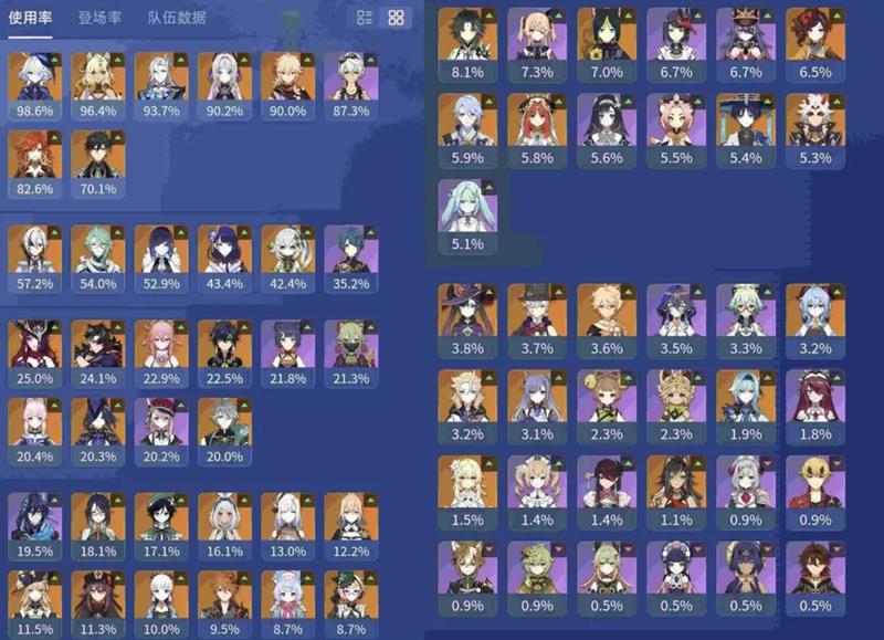 水龙王在本期深渊中表现不俗,以较高的使用率位列第三。茜特菈莉以90.2%的使用率位居第四,万叶则稍低于茜特菈莉,排名第五。