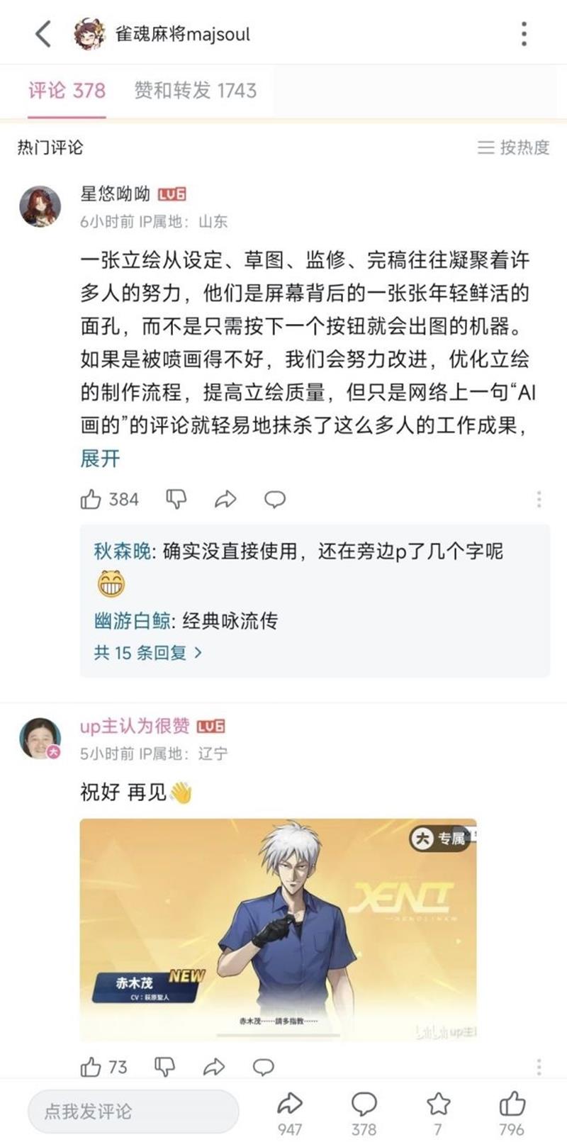 这使得《雀魂麻将》的六指海报事件在对比之下受到了更多的调侃和批评,许多玩家在评论区复读此前对《雀魂麻将》AI作画的否定言论,并晒出《麻雀一番街》的活动截图,进一步加剧了《雀魂麻将》的舆论压力。