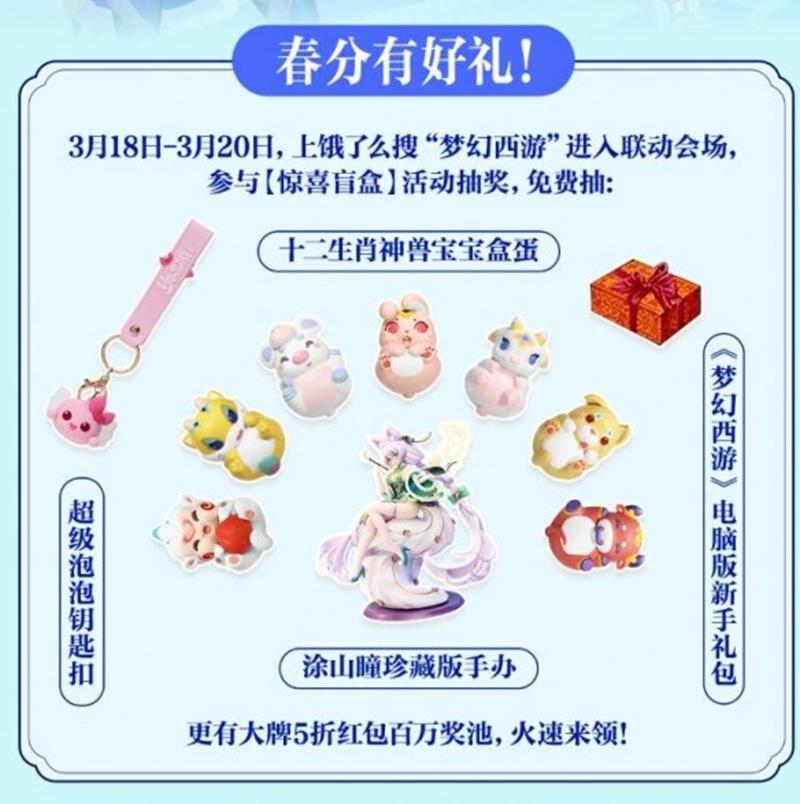 活动期间在饿了么搜“梦幻西游”即可进入联动页面,页面内可参与【惊喜盲盒】活动抽奖,玩家有概率抽到十二生肖神兽宝宝盒蛋、涂山瞳珍藏版手办奖励。以上的道具数量有限,抢完为止。