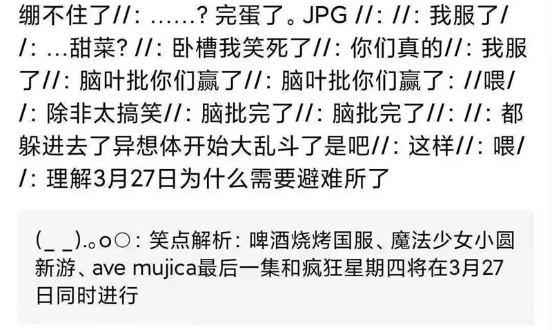 啤酒烧烤国服、魔法少女小圆新游、ave mujica最后一集和疯狂星期四将在3月27日同时进行