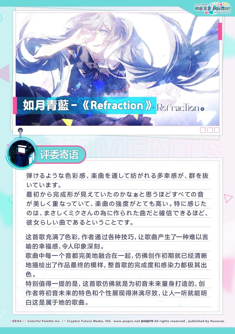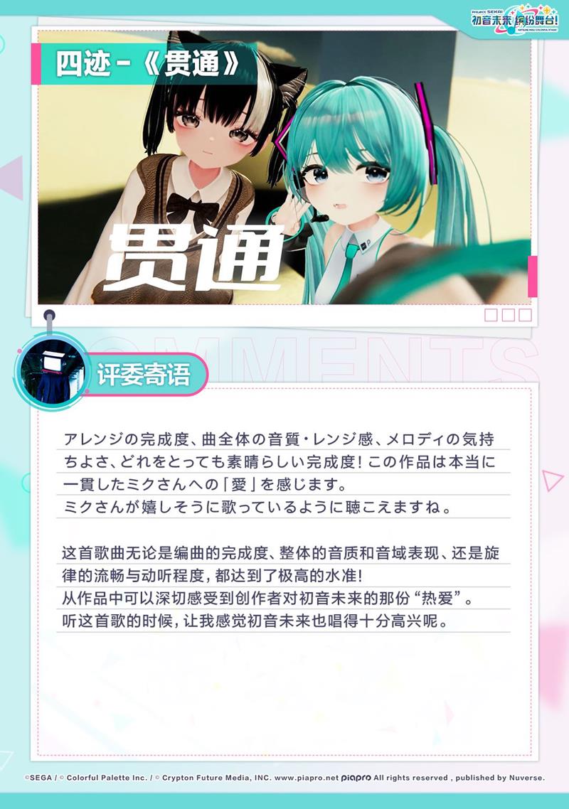 在优胜奖方面,小绵羊magens的作品《低彩度记事》脱颖而出。这首歌曲以独特的风格和富有感染力的旋律,展现了创作者对《初音未来:缤纷舞台》的热爱与理解。
