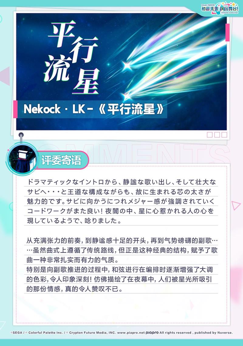 而人气奖则由四迹的《贯通》、如月青藍的《refraction》以及Nekock·LK的《平行流星》获得。这些作品不仅在音乐创作上表现出色,还深受广大“世界”居民的喜爱。通过这次活动,可以看出玩家们对《初音未来:缤纷舞台》的热情和对音乐创作的执着追求。