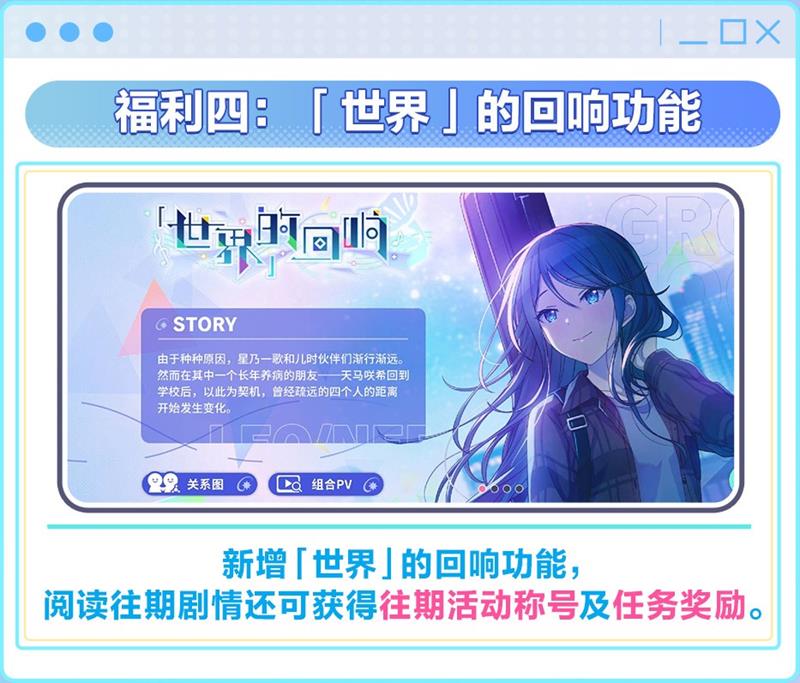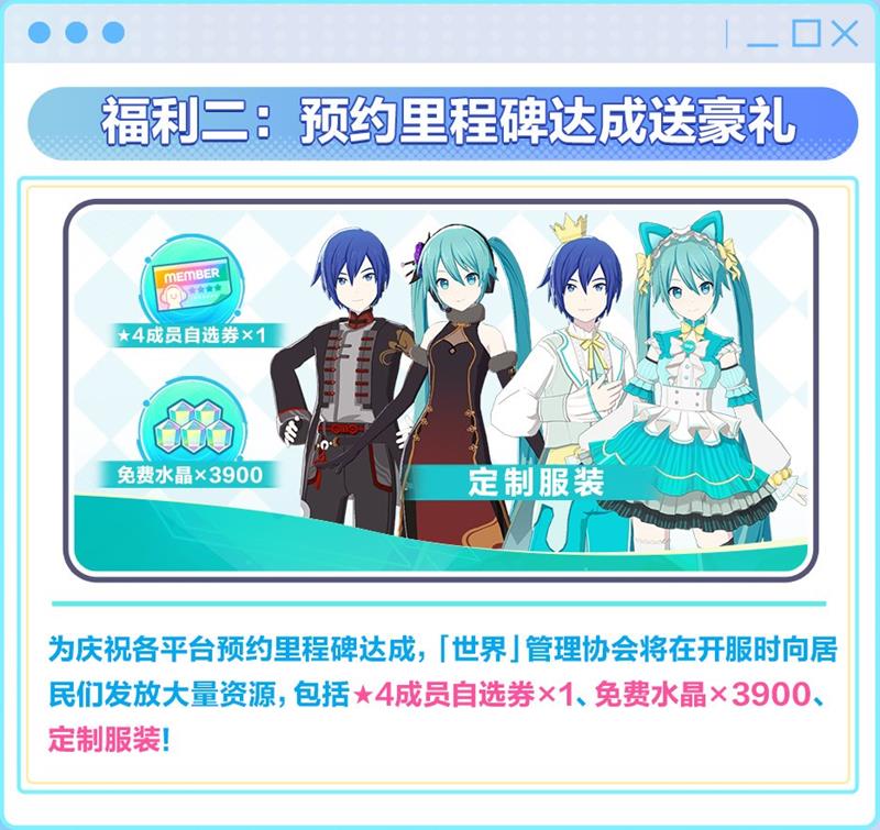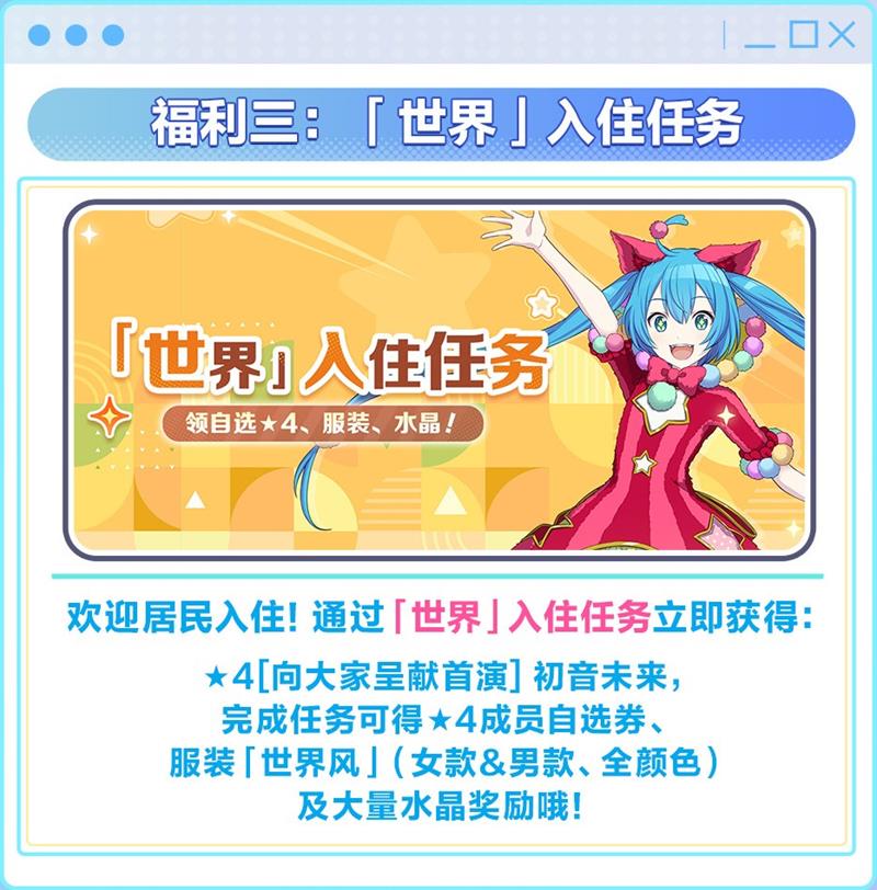 此外,游戏还设有“世界”入住任务,欢迎居民们入住。通过完成入住任务,居民们可以立即获得★4[向大家呈献首演] 初音未来(猫葱)。完成任务后,还可获得★4成员自选券、服装“世界风”(女款&男款、全颜色)以及大量水晶奖励。