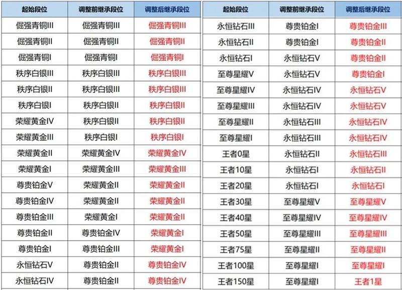 ⑤段位继承调整:铂金三-王者19星继承后比以前低了一个小段位,王者20/30/40/50/75/100星继承规则不变,王者150星可继承到王者1星。