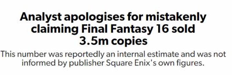 分析师随后修正了这份报告,并在道歉声明中指出:“原文章中提及的《最终幻想16》销量数据并非Square Enix官方发布,而是东洋证券的估算,作者在表述中存在错误。对此,我们深感抱歉,并特此更正。”