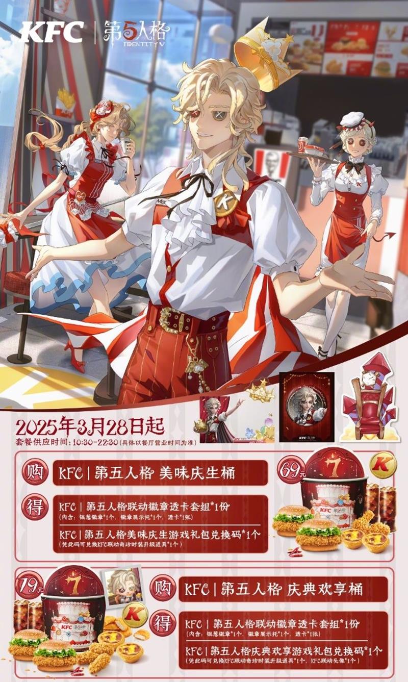 从3月20日维护更新后至4月18日23:59,玩家们参与《第五人格》游戏内的肯德基第三弹联动特别活动,将有机会获得“骑士”、渔女和调香师三款KFC联动独特时装。3月28日起,购买KFC|《第五人格》美味庆生桶,可获得《第五人格》联动徽章透卡套组一份和《第五人格》美味庆生游戏礼包兑换码一个,兑换码内含联动奇珍时装升级道具。