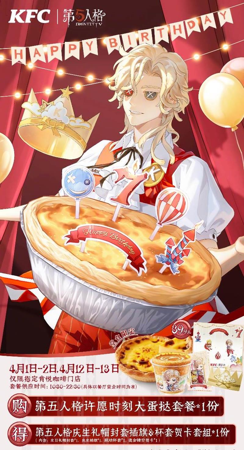 从4月1日起,在肯悦咖啡门店以及指定KFC|《第五人格》主题店,购买一杯「五仁」蛋挞拿铁,可获得《第五人格》联动杯套贺卡套组一份。4月1日至2日以及4月12日至13日,在指定肯悦咖啡门店购买《第五人格》许愿时刻大蛋挞套餐一份,可获得《第五人格》庆生礼帽封套插旗及杯套贺卡套组一份。