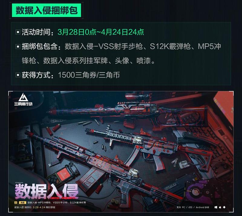 - 捆绑包包含: 数据入侵-VSS射手步枪、S12K霰弹枪、MP5冲锋枪、数据入侵系列挂军牌、头像、喷漆