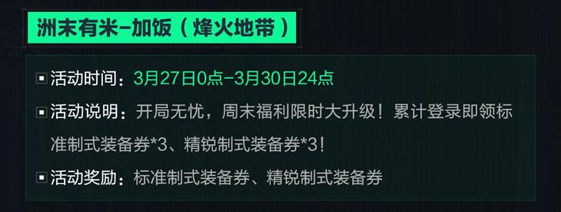 - 活动说明: 开局无忧,周末福利限时大升级!累计登录即领标准制式装备券*3、精锐制式装备券*3!