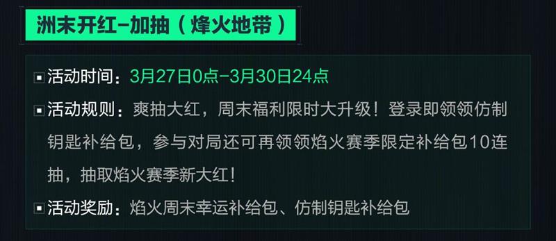 - 活动规则: 爽抽大红,周末福利限时大升级!登录即领仿制钥匙补给包,参与对局还可再领焰火赛季限定补给包10连抽,抽取焰火赛季新大红