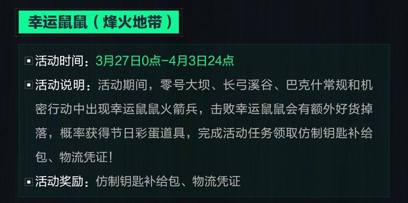 - 活动说明: 活动期间,零号大坝、长弓溪谷、巴克什常规和机密行动中出现幸运鼠鼠火箭兵,击败幸运鼠鼠会有额外好货掉落,概率获得节日彩蛋道具,完成活动任务领取仿制钥匙补给包、物流凭证