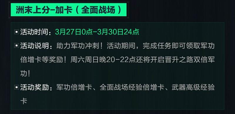 - 活动说明: 助力军功冲刺!活动期间,完成任务即可领取军功倍增卡等奖励!周六周日晚20-22点还将开启晋升之路双倍军