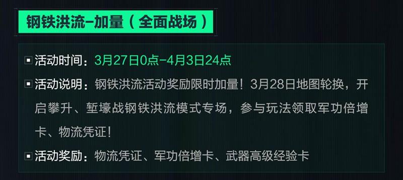 - 活动说明: 钢铁洪流活动奖励限时加量!3月28日地图轮换,开启攀升、堑壕战钢铁洪流模式专场,参与玩法领取军功倍增卡、物流凭证
