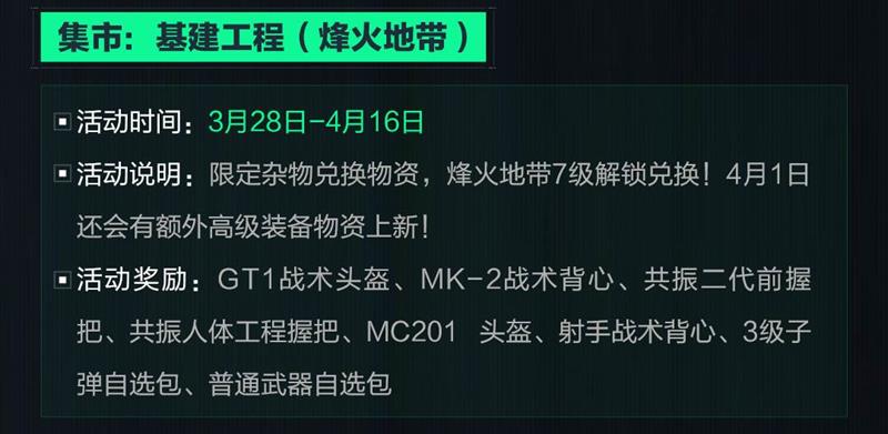 - 活动说明: 限定杂物兑换物资,烽火地带7级解锁兑换!4月1日还会有额外高级装备物资上新