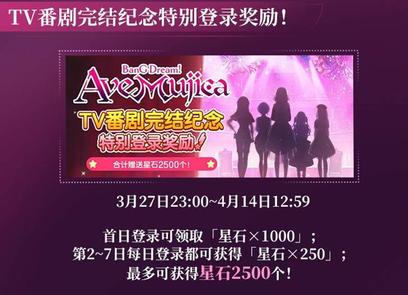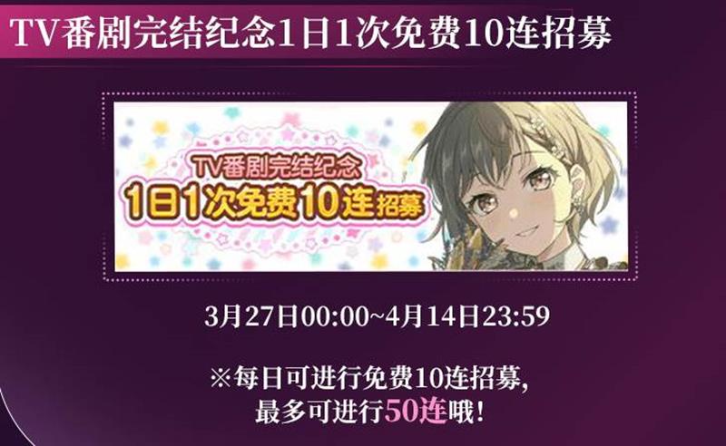 根据官方公告,活动将包括TV番剧完结纪念特别登录奖励以及TV番剧完结纪念1日1次免费10连招募两大部分。特别登录奖励活动将在3月27日23:00至4月14日12:59期间进行,首日登录可获得星石1000个,接下来的第2至第7日每日登录均可获得星石250个,累计奖励最高可达2500个。而免费10连招募活动将从3月27日00:00开始至4月14日23:59,每天玩家均可进行一次免费10连招募,累计最多可进行50连。