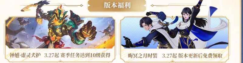 赛季皮肤虚灵犬护上线,免费联动皮肤苏烈-春野闲踪完成每日登录和每日1场对局任务,免费获取。元流之子小黄鸭时装上线,累计登录4天可领取。