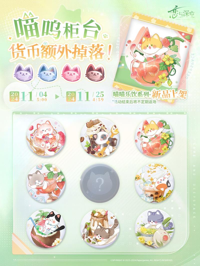 此外,“喵喵乐饮”徽章限时返场。4月1日上午5点至5月1日上午4点59分,喵喵乐饮将重返喵呜柜台,猎人可使用对应男主的喵呜币获取该系列徽章。后续该系列徽章也将加入常驻喵呜徽章轮换中。