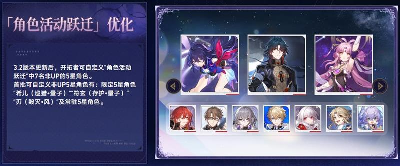 3.2版本更新后,开拓者可以在「角色活动跃迁」中自定义选择7名非UP的五星角色。首批加入清单的角色包括「符玄(存护·量子)」「刃(毁灭·风)」「希儿(巡猎·量子)」以及常驻五星角色。这意味着玩家可以根据自己的需求,灵活选择非UP角色,进一步丰富队伍搭配的可能性。