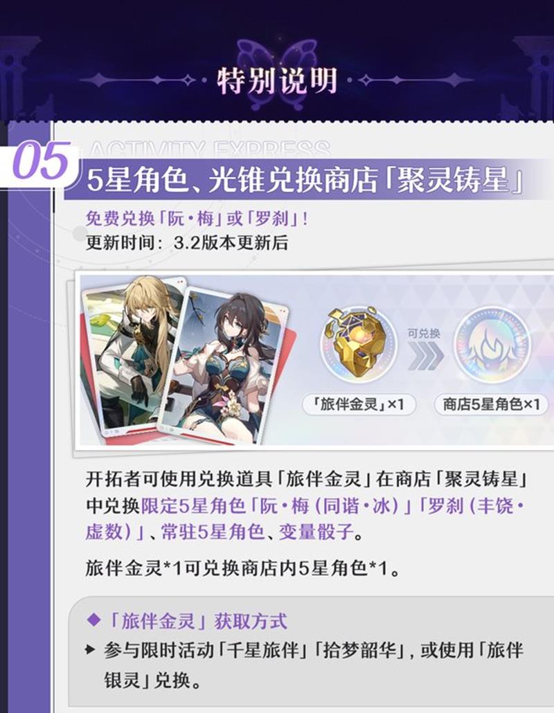 星魂溢出兑换:建议积累「旅伴银灵」兑换「旅伴金灵」,并在「聚灵铸星」商店中选择适合自己的五星角色,进一步提升队伍实力。