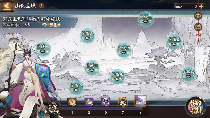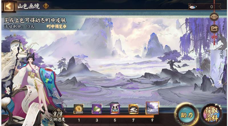 当阴阳师大人完成区块上色达到指定进度时,可依次解锁获得四星奉为达摩、御行达摩碎片等珍贵奖励。而当所有区块上色完成后,大人还可以免费领取活动限定的动态町中皮肤“山色画境”,感受远山缥缈、清溪幽邃的仙境之美,让妙手点染的素纸展现出如梦如幻的山水画卷。
