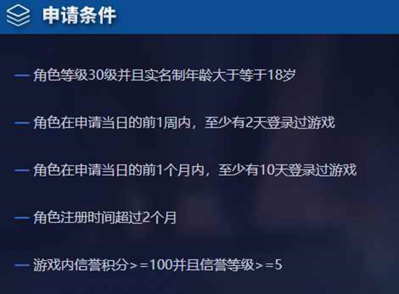 游戏内信誉积分需大于等于100,且信誉等级需大于等于5。