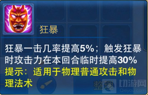 狂暴一击几率提高5%;触发狂暴时攻击力在本回合临时提高30%。