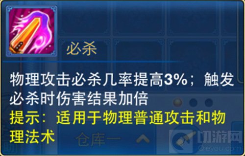 物理攻击必杀几率提高3%;触发必杀时伤害结果加倍。