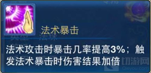 法术攻击时暴击几率提高3%;触发法术暴击时伤害结果加倍。
