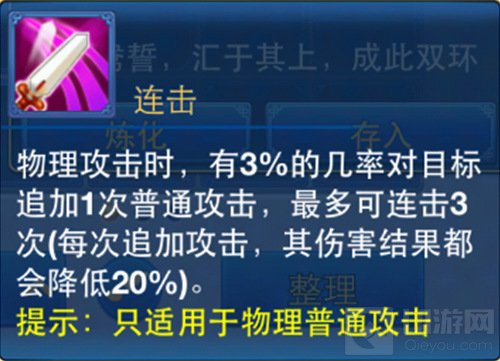 物理攻击时,有3%的几率对目标追加一次普通攻击,最多可连击3次(每次追加攻击,其伤害结果都会降低20%)。