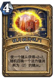 在之前的无责任吐槽鸡肋卡的文章中,小编就把这张银月城传送门列入了鸡肋卡的行列。不过,这张牌如果放在其他职业中或许还有一席之地,但是在四费超值卡云集的圣骑士中,特别是现在天梯的环境下,这张牌没有任何意义。论buff能力比不上王者祝福、神圣之力、英勇圣印等,论召唤随从能力...2费随机随从是什么样子可以参见一下上个版本的收割机,稍有不慎就是末日预言者。目前圣骑士4费必带真银圣剑、奉献,再加上一两个四费随从,这个费用已经接近饱和,不可能再有空间给这张传送门了,因此如果不是在竞技场,在天梯中这张卡的价值不大。