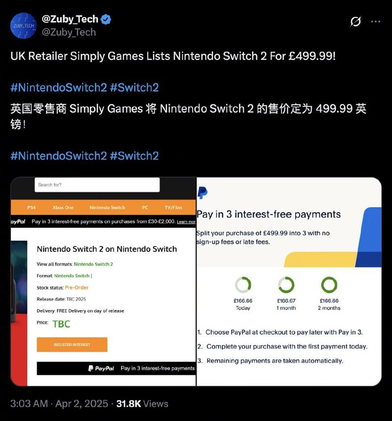 据推特用户“Zuby_Tech”爆料,英国零售商 Simply Games 已在其网站上将 Switch2 的售价标注为 499.99 英镑,约合人民币 4696 元。这一价格明显高于此前业内预期的 400 至 450 美元之间。Switch2 的准确价格信息将在今晚的 Switch2 专场直面会上公布。