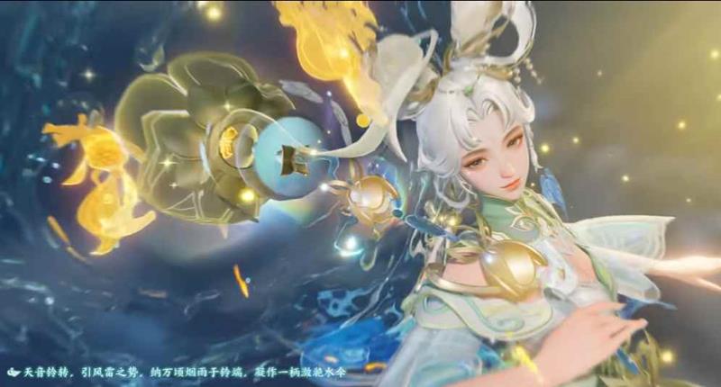 云神阿离持天音铃沟通天地,掌晴雷雨护佑苍生。脱手化伞,收伞为铃,倩影穿梭战场,铃声悠扬相伴。