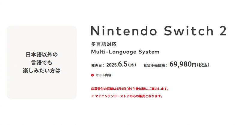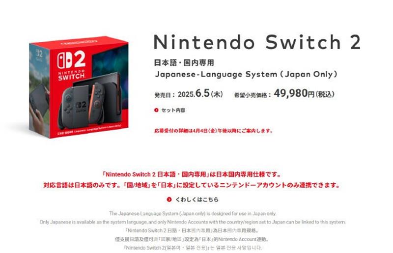 首先,任天堂Switch2的发售时间已经确定为今年6月5日,而其售价也已经公布。日版Switch2的售价为49980日元,约合人民币2429元。这一版本仅支持日语,并且只能与“国家/地区”设置为“日本”的任天堂账户关联。