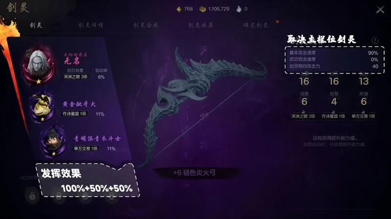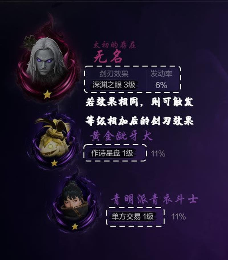 每个剑灵还能造成不同的剑刃效果,比如深渊之眼剑刃对75%以下生命的目标发动剑灵时,有一定概率造成对方最大生命值7%的伤害;作诗新盘剑刃则有几率增加攻防5秒。若剑刃效果相同,可触发等级相加后的剑刃效果。