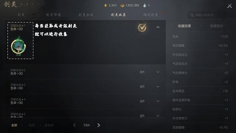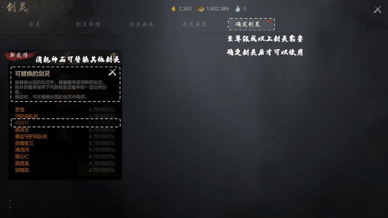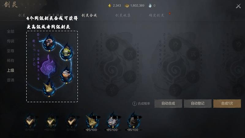 剑灵合成与收集也是提升剑灵品质的重要途径。若未抽到理想的剑灵,可通过剑灵合成来获取更强的剑灵。合成4个同级剑灵需要25个相同剑灵结晶,重复获得已拥有的剑灵会自动转化为25个对应剑灵结晶。每次获取或升级剑灵后,新剑灵会记录在剑灵收集中。当获取至尊级或以上的剑灵时,需要在确认剑灵界面使用确定按钮来选定该剑灵,若不想要该剑灵,可消耗神石重新抽取其他相同级别的剑灵。