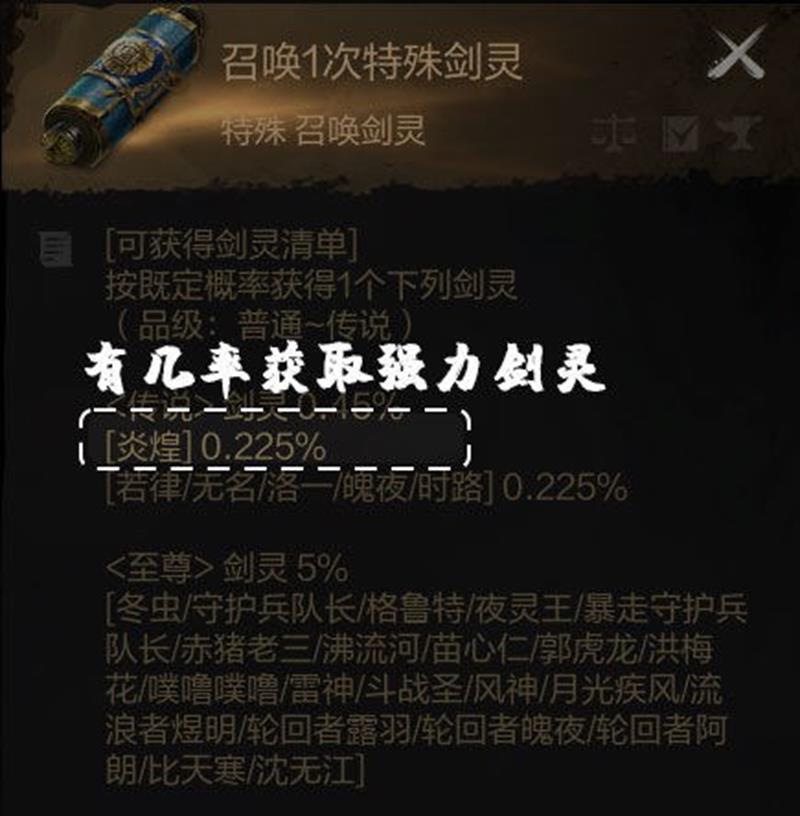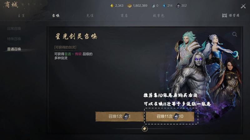 剑灵的获取方式主要有召唤剑灵,需消耗剑灵召唤卷,不同召唤消耗不同的召唤卷。召唤分为日常、特殊和普通召唤,日常和普通召唤出的剑灵相同,但日常召唤出好剑灵的几率更大,需要花费神石。特殊召唤消耗神石,有几率获取特殊强力剑灵,而普通召唤和日常召唤则无法获取这些特殊剑灵。玩家可根据自身召唤卷的数量选择购买召唤,从而获取剑灵。如果有10个召唤卷,推荐购买右边的选项,可多获得一次召唤机会。