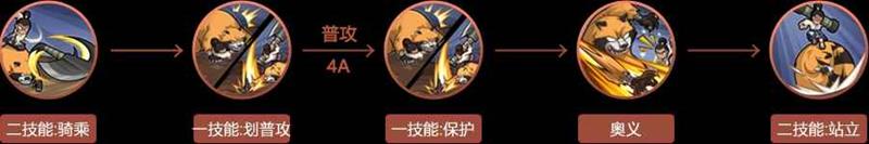 我们通过二技能进行远程先手后可以靠近,使用一技能划普攻抓取对手打伤害。保持距离使用普攻4A进行连击,等待一技能冷却完成后点击释放切换到站立状态。若对方没有反打能力可以选择开启奥义打伤害,后续还可以继续衔接二技能保持连击。