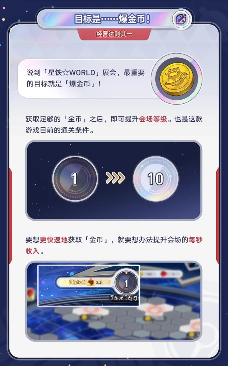 在「星铁☆WORLD」中,核心目标是通过经营展会获取「金币」,提升会场等级。金币的获取速度取决于会场的每秒收入,而提升收入的关键在于合理安排展台助理、组建羁绊关系以及解锁科技。